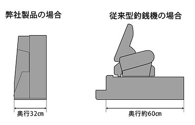 これまでは高額紙幣対応で硬貨と紙幣が循環する釣銭機を搭載すると本体のサイズ感が大きくなり設置スペースを考慮する必要がありましたが、弊社製品はそんな問題点を解決し奥行32cmを実現しました。